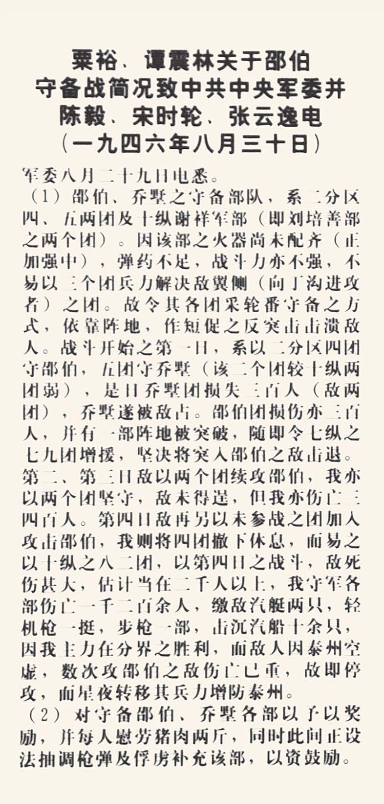 1946年8月30日,粟裕、谭震林关于邵伯守备战简况致中共中央军委并陈毅、宋时轮、张云逸电