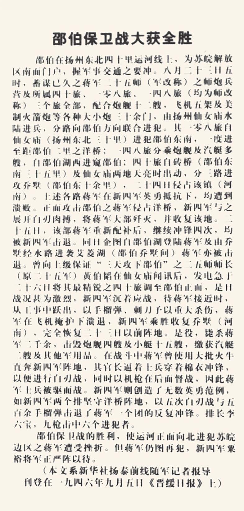 1946年9月5日,《晋绥日报》关于邵伯保卫战大获全胜的报道