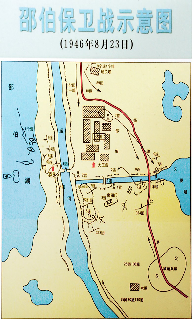 25日,国民党军集中优势兵力,向运河大堤二营阵地连续进行5次以上冲击,企图迅速占领邵伯。二营指战员以手榴弹、白刃格斗和阵前反冲锋,将国民党军消灭在阵地前。